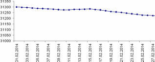 На графике № 8 продемонстрирована динамика средней цены смартфона. Отчетливо виден тренд снижения цены (несмотря на небольшой рост в середине месяца, за 28 дней февраля цена снизилась с 31 300 руб. до 31 220 руб. Снижение цены фиксировалось 23 дня из 28). Среднее значение средней цены за рассматриваемый период составило 31 263 руб. В течение этого время цена на рассматриваемое благо в традиционном магазине не изменялась и составляла 33 199 руб. (для сравнения была выбрана торговая сеть со средним уровнем цен). Таким образом, средняя цена в Интернете оказалась на 5,8% ниже цены традиционного магазина, что еще раз подтверждает выводы зарубежных экономистов, полученные в рамках исследований, описанных выше.