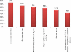 Основным преимуществом Интернет-магазинов большинство потребителей считает экономию времени (74 %). Немаловажное значение играет возможность доставки на дом (65 %), возможность избежать суеты (61 %). Круглосуточный режим работы отметили 58 % респондентов, за низкие цены и возможность приобрести товары, не представленные в регионе, 52 % и 43 % соответственно. Последний пункт особо актуален для потребителей, живущих в удаленных регионах.