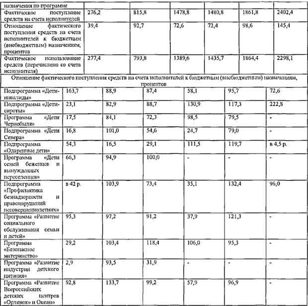 Особенно отрицательно недофинансирование сказалось на выполнении федеральных целевых программ по вопросам социальной защиты отдельных категорий населения. Так, по официальным данным Госкомстата России, в период с 1997 года по 2001 год наблюдалось систематическое недофинансирование федеральной целевой программы «Дети России» (табл. 15), вследствие чего фактическое поступление средств на счета исполнителей ежегодно не соответствовало бюджетным (внебюджетным) назначениям по программе. По сути дела, под угрозой срыва оказались несколько программ социальной защиты отдельных категорий, подрастающего поколения России, в т.ч. программы «Дети-инвалиды», «Дети-сироты», «Дети Чернобыля», «Дети Севера», «Одаренные дети», «Дети семей беженцев и вынужденных переселенцев», а также программы «Профилактика безнадзорности и правонарушений несовершеннолетних», «Развитие социального обслуживания семьи и детей», «Безопасное материнство», «Развитие индустрии детского питания», «Развитие Всероссийских детских центров «Орленок» и «Океан».