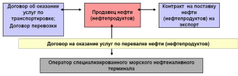 Выделенные стадии технологического процесса составляют единую комплексную услугу по перевалке нефтегрузов через специализированный нефтеналивной порт с целью их дальнейшего вывоза за пределы территории Российской Федерации. Данная транспортная услуга предоставляется на основании договора перевалки, сторонами которого является оператор специализированного морского нефтеналивного терминала и грузоотправитель. На схеме представлено место данного договора в общей системе договорных связей.