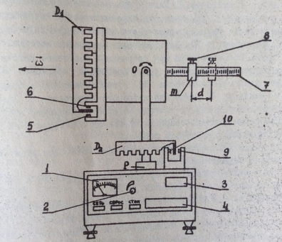 Экспериментальная установка (рис.4) содержит уравновешиваемый гироскоп с горизонтальной осью, приводимый во вращение электромотором. Частота вращения этого мотора может изменяться поворотом ручки 2 РЕГ.СКОРОСТИ. На ось гироскопа насажен диск