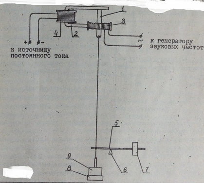 В лабораторной работе колебания возбуждаются в медной однородной струне, закрепленной вертикально. Схема установки показана на рис.4. Установка состоит из трех основных частей: вибратора, струны и механизма натяжения. Внешнее периодическое воздействие на струну осуществляется в верхней точке струны, где ее конец прикреплен к плоской пластине 1 – якорю вибратора. Сам якорь находится между полюсами электромагнита 2, обмотка возбуждения 3 которого питается переменным током от генератора звуковых частот. Кроме того, электромагнит имеет дополнительно обмотку подмагничивания 4, питаемую постоянным током, изменяя величину которого можно управлять амплитудой колебаний якоря, а следовательно, и струны. Амплитуда колебаний струны зависит также и от величины напряжения звуковой частоты, подаваемой с г