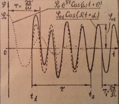 В этом случае колебания, рассматриваемого нами крутильного маятника, будут описываться уравнением (1), имеющим решение вида (3). Такие колебания представляют собой суперпозицию свободных затухающих колебаний с частотой