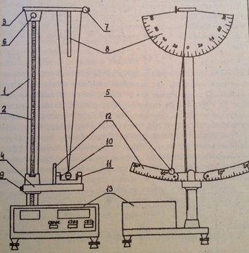 нити подвеса производят по шкале 2 при совмещении черных рисок на шарике с рисками, нанесенными на обойме, в которую вмонтированы лампочка и фотодетектор. Шкала 12 предназначена для точного отсчета малых углов отклонения маятника от положения равновесия.