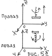 Существуют два вида координатных систем. Их различают с помощью правила буравчика. Будем ввинчивать буравчик с правой нарезкой, вращая его ручку в плоскости xy кратчайшим путем от положительного конца оси Х к положительному концу оси Y. В правой системе координат поступательное перемещение буравчика будет происходить в положительном, а в левой ‑ в отрицательном направлении оси z. (рис.5 б). В физике применяется исключительно правая система.