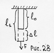 Рассмотрим поведение твердого тела как твердой сплошной ограниченной среды. Возьмем стержень из твердого материала длины l и сечения S. Укрепим его верхний конец так, что стержень примет вертикальное положение и будем к нижнему основанию стержня прикладывать силу F, направленную вниз. (рис.28).