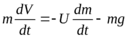 13. Пример. Найти связь между массой ракеты m(t), достигнутой ею скоростью V(t) и временем t, если ракета движется вертикально вверх в поле тяжести Земли. Скорость газовой струи U постоянна. Сопротивление воздуха и изменение с высотой ускорения свободного падения не учитывать. Какую массу газов (t) должна ежесекундно выбрасывать ракета, чтобы оставаться неподвижной относительно Земли?