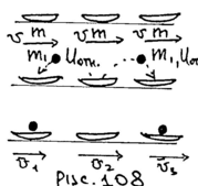 9.Пример. Три лодки одинаковой массы m идут в кильватер с одинаковой скоростью V. Из средней лодки одновременно в переднюю и заднюю лодки бросают со скоростью U относительно лодки грузы массы m1 . Каковы будут скорости лодок после переброски грузов?