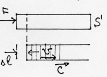 Рассмотрим поведение твердого тела как твердой сплошной ограниченной среды. Возьмем стержень из твердого материала длины l и сечения S. Укрепим его верхний конец так, что стержень примет вертикальное положение и будем к нижнему основанию стержня прикладывать силу F, направленную вниз. (рис.28).