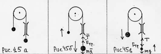 2. тело m1 движется вниз, тогда уравнение движения m1 a = mg - F - T, где Т - сила натяжения нити; (рис.45 б)