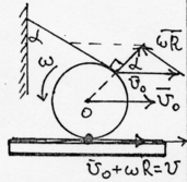 Выберем точку "С" - касания доски с катушкой. Скорость точки С складывается из скорости V0 оси катушки О и равной ей по модулю (проскальзывания нет) скорости точки С (относительно точки О), касательной к окружности в точке С. Если угловая скорость доски в этот момент времени равна , то линейная скорость той точки доски, которая касается катушки, будет равна R tg-1(/2). Так как доска все время касается катушки, скорость точки С относительно доски будет направлена вдоль доски, откуда R tg-1(/2)= V0 sin . Так как нет проскальзывания по горизонтальной поверхности, то