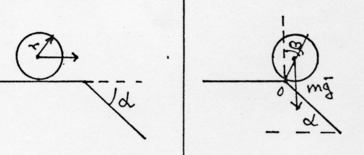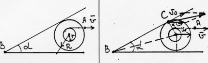 с горизонтом, катится без проскальзывания с некоторой скоростью V, перпендикулярной границе раздела плоскостей колесная пара, состоящая из двух легких колес радиуса r, насажанных на тонкую тяжелую ось. Определить, при каком значении V колесная пара перекатится с горизонтальной плоскости на наклонную без отрыва.(рис. 52 а)