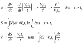 4. Пример. Лодка, имеющая скорость V0 спускает парус в момент времени t0, но продолжает двигаться. Во время этого движения произведены измерения скорости лодки, которые показали гиперболическую зависимость скорости от времени (1/t). Показать, что ускорение