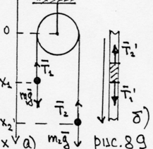 12. Вопрос. Найти натяжение нити Т в устройстве, показанном на рис.90. Массы тел равны: m1 = 100 г, m2 = 300 г. Весом блоков пренебречь. Нить невесомая и нерастяжимая.