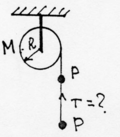 Вопрос. Однородный цилиндр массы М и радиуса R вращается без трения вокруг горизонтальной оси под действием груза Р, прикрепленного к легкой нити, намотанной на цилиндр. Груз Р прикреплен к такому же грузу Р (рис.118). Определить натяжение нити Т.