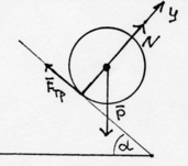 ример. Цилиндр радиуса R скатывается с наклонной плоскости, образующей угол с горизонтом. Масса цилиндра М. Найти ускорение цилиндра.(Рис.119)