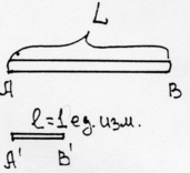 Надо задать длине числовое значение, если мы хотим получить количественную характеристику. Надо это сделать так, чтобы она была объективной. Для этого возьмем другое тело: твердое, прямое, с резкими границами A'B' и назовем его эталоном. Примем длину этого тела l за единичную. Сравним длину АВ с длиной A'B', составив отношение