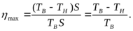 В случае тепловой машины потенциальную энергию "воды" верхнего озера можно было бы полностью превратить в работу, если бы "водопад" заканчивался на "уровне океана". Эта работа равна произведению "высоты" верхнего озера ТВ на расход жидкости S. Но уровень нижнего озера выше уровня верхнего озера на величину ТН, поэтому максимальная работа, которую можно получить от тепловой машины при заданной разности температур нагревателя и холодильника, равная (ТВ - ТН)S, а максимальный коэффициент полезного действия