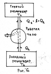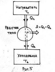В тепловой машине, производящей работу за счёт замкнутых циклов, рабочее тело получает от нагревателя количество теплоты Q1 и отдаёт холодильнику количество теплоты Q2, совершая работу Q1 - Q2 = A (см. рис. 5). Коэффициент полезного действия (к.п.д.) тепловой машины