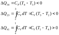 (4-1) изотермическое сжатие, при котором имеет место тепловой контакт с нагревателем, производится внешними силами. В реальности нагреватель - окружающая среда, которой передаётся тепло, отобранное у холодильника. В процессе сжатия температура рабочего тела на dТ должна быть выше, чем окружающая среда. Тепло, забираемое окружающей средой