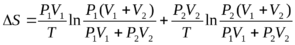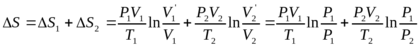 Задача. Два баллона ёмкостью V1 и V2 соединены трубкой с краном и оба заполнены одинаковым газом. Давление в сосудах, соответственно, P1 и P2. Найти изменение энтропии системы в результате перемешивания газов при открытом кране. Вся система изолирована в тепловом отношении. Начальная температура в баллоне одинакова и равна Т.