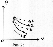 | 26.На диаграмме (P,V) показан ряд процессов. Кривая 2 - изотерма; кривая 4 - адиабата. Определив знак теплоёмкости С в процессах 1, 3, 5. Чему равна теплоёмкость в процессах 2 и 4? |