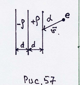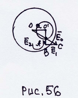 (рис. 56). Тогда, согласно принципу суперпозиции, напряжённость поля в любой точке однородного заряженного шара равна векторной сумме напряжённости поля с полостью и напряженности поля заряда, расположенного в полости. Рассмотрим произвольную точку внутри полости. Её расстояние от центра сферы обозначим
