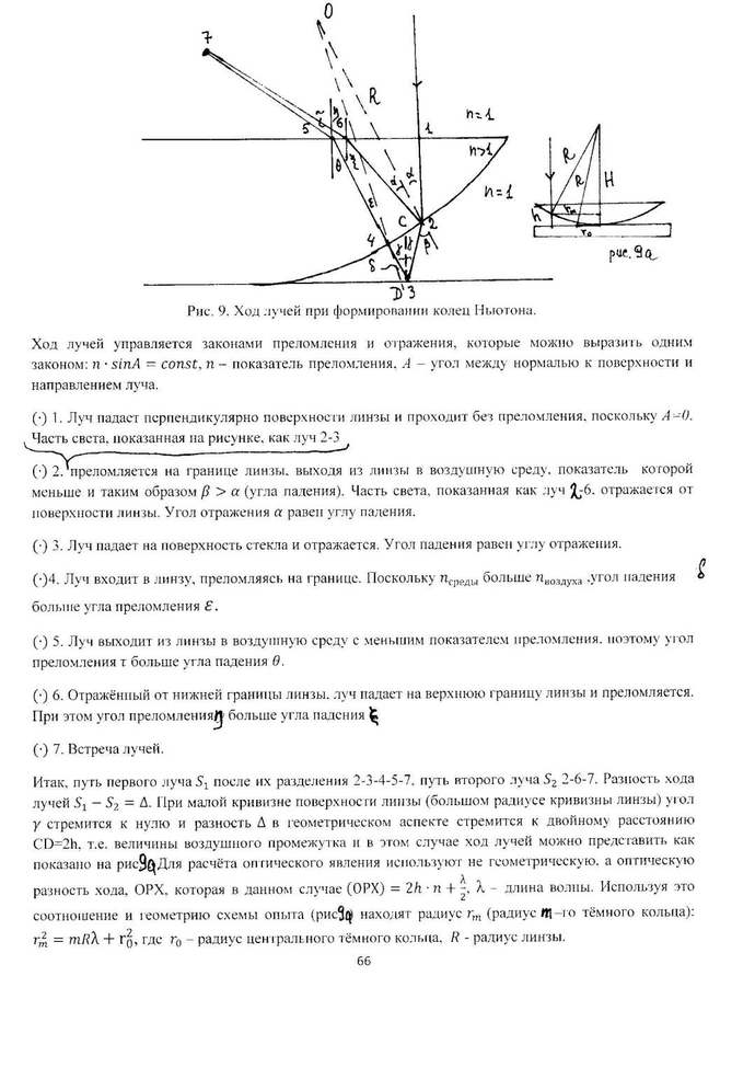 Частный пример. Кольца Ньютона. Интерференционные полосы равной толщины в форме колец, расположенных вокруг точки касания двух сферических поверхностей, либо плоскости и сферы впервые описаны Ньютоном в 1675 г.(рис. 9). Если длина волны известна, то кольца Ньютона можно использовать для точного измерения радиусов поверхностей линз и контроля правильности формы сферических и плоских поверхностей.