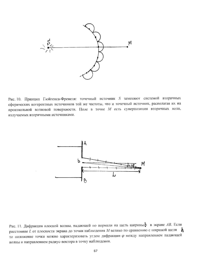 Простейшая дифракция на щели (рис. 11). Плоская монохроматическая волна с длиной волны λ падает на плоский экран с отверстием ширины b. Рассмотрим излучение вторичных источников в плоскости чертежа, перпендикулярной к экрану и направлению щели. Введём угол дифракции