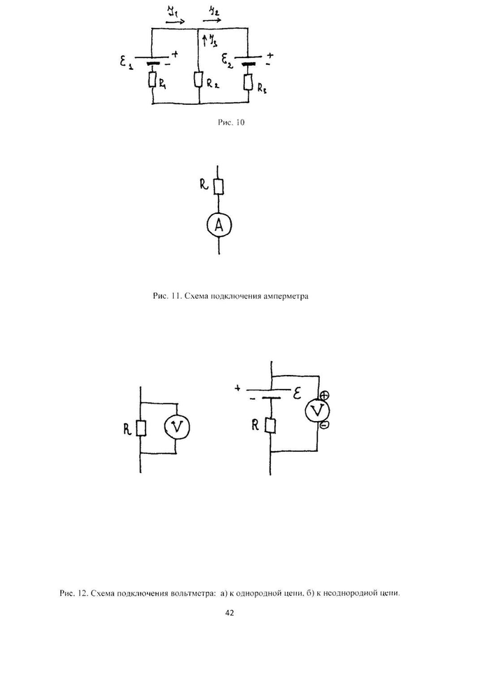 Силу постоянного тока измеряют прибором, который называют амперметром. Амперметр подсоединяют к цепи последовательно (рис. 11). В этом случае он вносит в цепь дополнительное сопротивление, искажая значение тока, и чтобы это искажение было минимальным сопротивление амперметра должно быть очень маленьким.