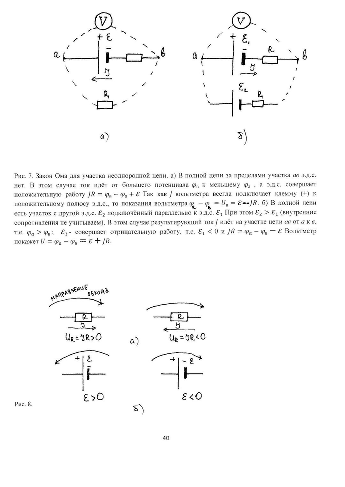 Рассмотрим подробнее закон Ома для неоднородной цепи. В этом законе рассматривается часть цепи и если во всей цепи других э.д.с. нет, то в такой цепи ток идёт от положительного полюса э.д.с. к отрицательному, направление движения зарядов совпадает с направлением напряжённости поля и производится положительная работа (рис. 7а). Таким образом, если имеет место участок ав, где