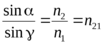 ‑ называют относительный показатель преломления; т.е. отношение синуса угла падения к синусу угла преломления равно относительному показателю преломления сред 2 и 1.