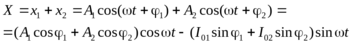 в) Переведём выражение в вещественное представление, для этого надо оставить только действительную часть. Оставляя её, убеждаемся, что получен тот же результат, ч то и прямым сложением колебаний в действительном представлении.