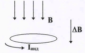 | Рис.34. Направление индукционного тока. | кону Фарадея в витке возникает ЭДС индукции. Направление индукционного тока таково, что он своим действием препятст-вует изменению магнитного поля. Если внешнее магнитное поле возрастает, его изменение В направлено по полю (см. рис.34), и напрвление индукционного тока должно быть таким, чтобы маг-нитный момент витка Iинд S был нап равлен против поля В. Как уже указывалось (§ 6-4) величина ЭДС индукции определяется выражением |