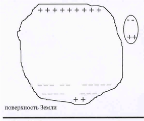 | Рис.33. Структура грозового облака. | что разные части облака несут разный заряд (см. рис.33). Нижний слой тучи, как правило, несет отрицательный заряд, однако в середине слоя существует область положительного заря-да. Эта область – своебразное сердце грозы. Существующее вокруг ее электрическое поле ионизирует окружающий воздух, постоянно порождая положительные и отрицательные за-ряды.Дождевые капли, двигаясь к Земле, поля-ризуются. Земля несет отрицательный заряд, поэтому на нижней части капли возникает по-ложительный заряд. Увеличенное изображение капли приведено в правой части рисунка. При движении капли вниз – ее нижняя часть поло-жительна, - и она притягивает отрицательные |