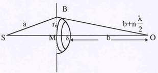 дошедший до экрана, имеет радиус SB = а (см. рис.47). Расстояние от точки наблюдения О до плоскости экрана равно МО = b+. Мысленно разобьем волновой фронт на концентри-ческие зоны ( на рис.47 показана одна зона) так, что расстояние от n – зоны до точки наблю-дения О равно b + n/2. Из треугольника SBM по теореме Пифагора получим: