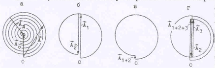 | Рис.46. Векторные диаграммы для разного числа зон. | показан на рис.46( б,в и г). Как видно из рис., две зо-ны почти уничтожаются, а амплитуда третьей зоны почти равна амплитуде первой. Там же показано (рис.46а) действие всего волнового фронта А0, ког-да препятствие отсутству- |