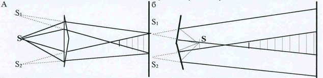 «Раздвоение» источника достигается либо преломлением в призме, либо отражением в двух зеркалах. Угол «разворота» зеркал и преломляющий угол призмы близки к 1800 для того, чтобы достичь наилучшей видимости картины интерференции.
