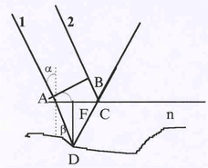1 и 2 = 2n(AD) – BC +/2. Величина /2 добавляется потому, что происходит изменение фазы волны на 180 0, что эквивалентно увеличению пути на /2.Из рис можно увидить, что AD = DF/cos;AF = DFtg;AC = 2AF= =2DFtg;BC =ACsin = 2DFtg sin. Согласно закону преломления света sin = nsin. C учетом этого = 2nDF/cos - 2DFsintg + +/2 = 2nDF(1- -sin2)/cos +/2 = 2DFcos +/2.