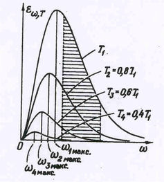 | Рис.61 Зависимость излучатель- ной спосбности от частоты и температуры. | Графическая зависимость излучательной способности приведена на рис.61, где по оси частот отложена угло-вая частота =2n. § 13-3 Законы Стефана- Больцмана и Вина. Из рис.61 видно, что для каждой температуры излучательная способность имеет максимальное значение при определенной частоте излучения. Для определения этой частоты проведем исследова-ние на экстремум величины ,Т , предварительно проведя замену перемен-ной в целях сокращения записи. Введем новую переменную х: Теперь выражение для излучательной способности приобретает такой вид: |