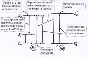 Такое метастабильное состояние обычно получается в атомах примеси, находящихся в окружении "чужих" атомов. Причины такой метастабильности суть прямое следствие квантовомеханических расчетов, которые в нашем курсе не проводятся. Длительность пре-бывания атома в метастабильном состоянии в несколько тысяч раз превышает их время жизни в обычном возбужденном состоянии. Для того, чтобы процессы излучения превалировали над процессами поглощения, требуется создать инверсию заселенности атомных уровней, т.е.добиться того, чтобы число атомов с энергией Е2 было больше.чем число атомов с энергией е1 (Е2 >E1). Такая инверсионная заселенность достигается с помощью внешнего воздействия: это либо сильный некогерентный свет, как в рубиновом лазере, либо газовый разряд - в газовых лазерах, где энергия передается путем ионизации при столк-новениях. Схема получения когерентного излучения в газовом лазере, работающего на сме-