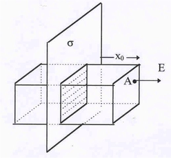 | Рис.6. Поле от плоскости. | Пусть имеется плоскость, равномерно заряженная с поверхностною плотностью .Требуется найти напря-женность электрического поля в точке, отстоящей от плоскости на расстояние х0. Для решения задачи про-ведем замкнутую поверхность через заданную точку А (см. рис.6).Поверхность имеет форму прямоуголь-ного параллелепипеда, боковые грани которого пер-пендикулярны заряженной плоскости. Выбор такой формы поверхности связан с тем, что вектор напря-женности электрического поля Е вблизи плоскости должен быть нормален к ней. Кроме того, наша вооб-ражаемая поверхность должна быть симметричной относительно заряженной плоскости. Полный поток через поверхность параллелпипеда складывается из |