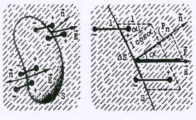 оретет поляризационный заряд Qп. Для участка поверхности S (правая часть рис.14) через S войдут отрицательные заряды тех и только тех молекул, которые находятся в параллелепипеде с площадью основания S и высотой lcos, где l – величина возможного смещения зарядов в молекуле, а - угол между внешней нормалью к поверхности и вектором поляризации. Объем параллелепипеда равен S lcos, следовательно в нем находится n0S lcos молекул (n0 –концентрация молекул). При этом левому основанию параллелепипеда должна соответствовать внешняя нормаль, направлен-ная налево (угол - тупой), а для правого основания - угол - острый. Через левое основа-ние выходит, а через правое – входит отрицательный заряд. Поэтому и для левого и для правого оснований появится знак минус, т.е. Qп = - q n0S lcos ( q- заряд каждой моле-кулы). Учитывая, что q n0 l = Р0 – величина вектора пояризации и Р0 cos=Рn , получим: Qп = - Рn S.