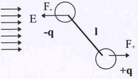 | Рис.13. Ориентирующее действие на диполь внеш-него поля. | ориентирующее действие на каждый диполь. Как следует из рис.13, возникает вращающий момент, под действием кото-рого все диполи стремятся выстроиться вдоль направления поля.Однако этому стремлению противодействуют различные причины: внутренние силы, действующие между молекулами, тепловое движение молекул и т.п. Поэтому возникает некоторая преимущественная пространственная ориентация диполей, степень которой характеризуется вектором поляризации, определяемым как суммарный дипольный момент единицы объема, т.е. |