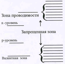 Самые внешние электроны образуют зону проводимости, а следующему ниже-лежащему уровню соответствует валентная зона (см. рис.15). Между зоной проводимости и валентной зоной может располагаться запрещенная зона, т.е. набор значений энергии, приобретение которых электронами в данном веществе оказывается невозможным. Теория, оперирующая понятиями зоны, получила название зонной. С точки зрения зонной теории вещества разделяются на три класса: проводники, изоляторы и полупроводники. Принадлежность конкретного вещества к тому или иному классу определяется как расположением перечисленных зон, так и степенью их заполнения. Здесь сразу надо отметить, что валентная зона для простоты считается полностью заполненной. Если каждый атом вещества отдает в зону проводимости один электрон, то зона оказывается заполненной наполовину – на каждом уровне размещаются два электрона с противоположными спинами. Под действием внешнего электрическогополя электроны приобретают дополнительную энергию и переходят на свободные вышележащие подуровни. Может случиться и так, что зона проводимости – пуста, но запрещенная зона отсутствует, и под действием поля электроны из валентной зоны переходят в зону проводимости. В обоих случаях вещества будут проводить электрический ток. Если же в веществе зона проводимости пуста, а валентная зона отделена от нее достаточно широкой запрещенной зоной значений энергии, то такое вещество является изолятором. Нужны крайне высокие (несколько десятков или даже сотен киловольт) значения внешнего напряжения, чтобы электроны материала оказались бы переброшены через запрещенную зону. Наконец существуют элементы (гер-маний и кремний), у которых запрещенная зона довольно узкая, и энергии теплового движения оказывается достатлчно, чтобы электроны из валентной зоны перебрасывались бы в пустую зону проводимости. При комнатных температурах таких электронов находится сравнительно мало, количество носителей в зоне проводимости незначительно по срав-нению с металлами, и такие вещества получили название полупроводников.
