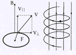 В общем случае, когда скорость заряда составляет с направлением поля произволь-ный угол (см. рис.26.), траектория движения представляет собой винтовую линию, ось ко-торой совпадает с направлением поля. Движение заряда можно рассматривать в этом случае как сложение двух движений: вращения вокруг направления поля, обусловленного сос-тавляющей вектора скорости, нормальной к направлению В, и поступательного движения со скоростью, равной другой составляющей, параллельной полю.