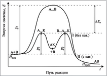 Схематически соотношения между энергиями активации реакции в присутствии катализатора и без него можно представить на энергетической диаграмме. В процессе каталитической реакции образуются два активированных комплекса, [A…Кат] и [A…Кат…В], с существенно меньшими энергетическими затратами, чем при образовании активированного комплекса [A…B] в отсутствие катализатора, поэтому каталитическая реакция идет с гораздо бошей скоростью при той же температуре.