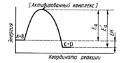 Энергетический профиль показывает, как изменяется энергия реагирующих молекула в ходе их превращения в продукты реакции. При взаимодействии молекул исходных веществ сначала образуется переходное состоянеме [A...B], в котором старые связи в молекулах А и В уже отчасти разорваны, а новые еще не образовались. Энергия переходного сост больше энергии исходных молекул и продуктов, и на энергетическом профиле он соответствует вершине барьера, отделяющего исходные вещества от продуктов реакции. Образовывать активированный комплекс могут только молекулы, получившие в результате теплового движения дополнительную энергию, большую или равную Еа. активированный комплекс существует непродолжительное время, после чего распадается, образуя частицы продуктов реакции.