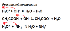 Р-ция нейтрализации заключ в переносе протона от иона гидрокслония к гидроксид иону. В р-циях дисс вода - основание, кот принимает протон к-ты. а в случае с дисс осн вода - к-та. Сила электролита зависит от природы р-рителя. НCl - сильная к-та в воде, потому что вода - более сильное основание, чем Cl- и способна необратимо отнять у него протон. Поэтому в жидком аммиаке уксусная к-та ведет себя как сильная.