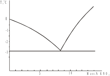 1) Определите по диаграмме температуру замерзания раствора, содержащего 5 масс.% KNO3.